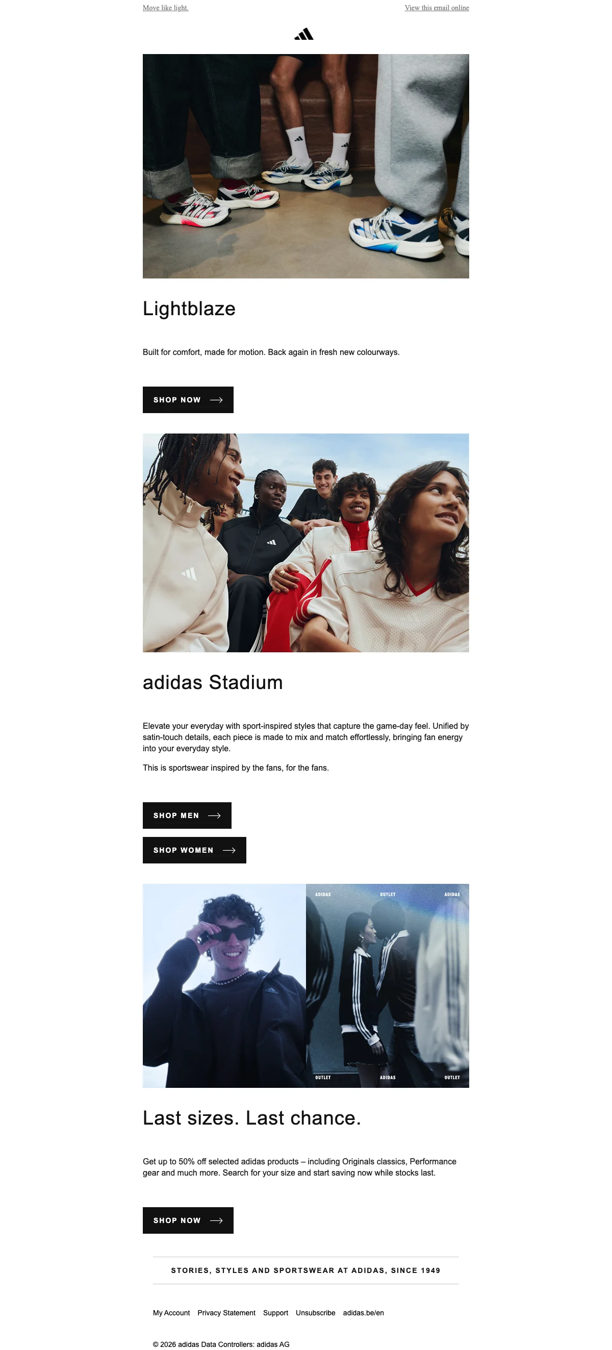 Adidas is het wereldberoemde merk voor de echte sport superstar! Voor elke sport heeft adidas wel een sportieve, professionele outfit in de aanbieding. Adidas staat voor kwaliteit als het gaat om je sport beoefenen. Vooral gericht op sporten als voetbal, basketbal, hardlopen en fitness. Met de beste kledij en adidas sneakers voor heren, dames en kinderen. Er bestaat zelfs de mogelijkheid om zelf je eigen adidas schoenen te ontwerpen. Hoe persoonlijk wil je het hebben. Jacks, hoodies, vesten, trainingspakken, sweaters, alles om nog sneller te gaan. Adidas heeft verschillende schoenen- en kleding merken: