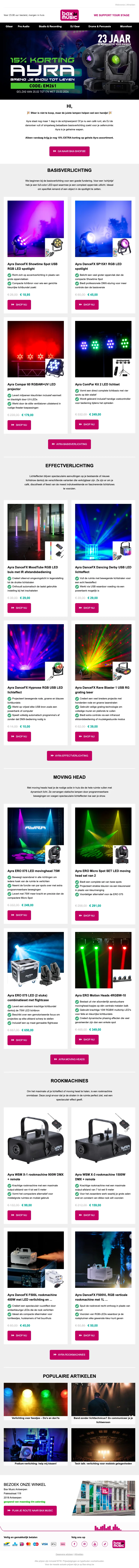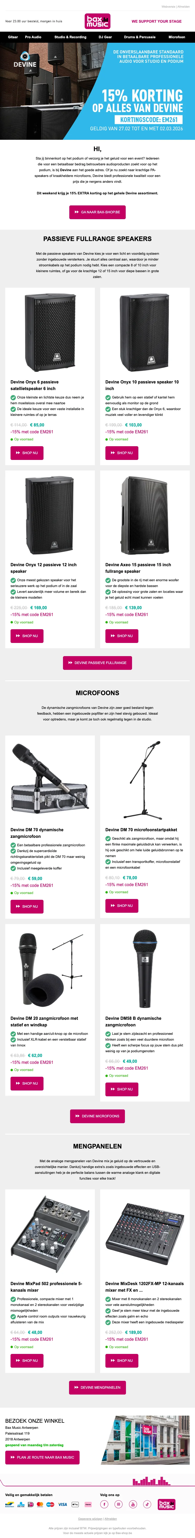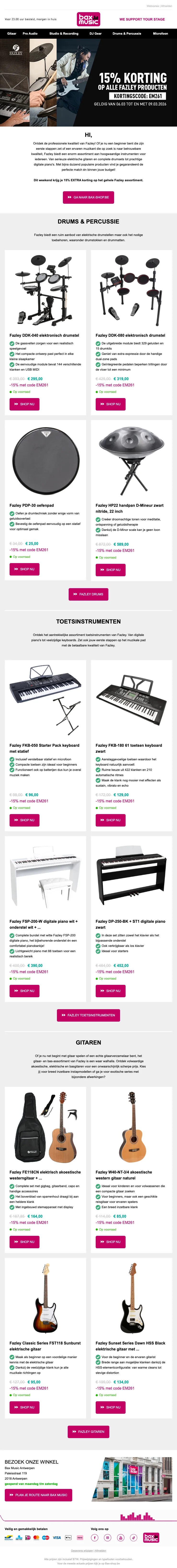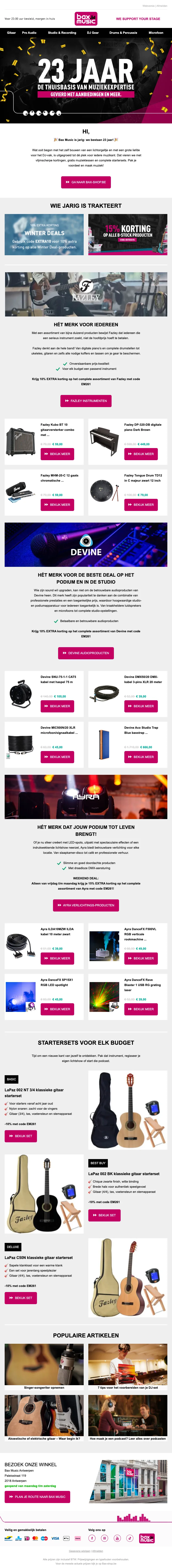 Wil ja graag een Bax Music kortingscode, schrijf je dan in voor de nieuwsbrief van de webshop. Je ontvangt regelmatig nieuwe aanbiedingen en codes in je mailbox.