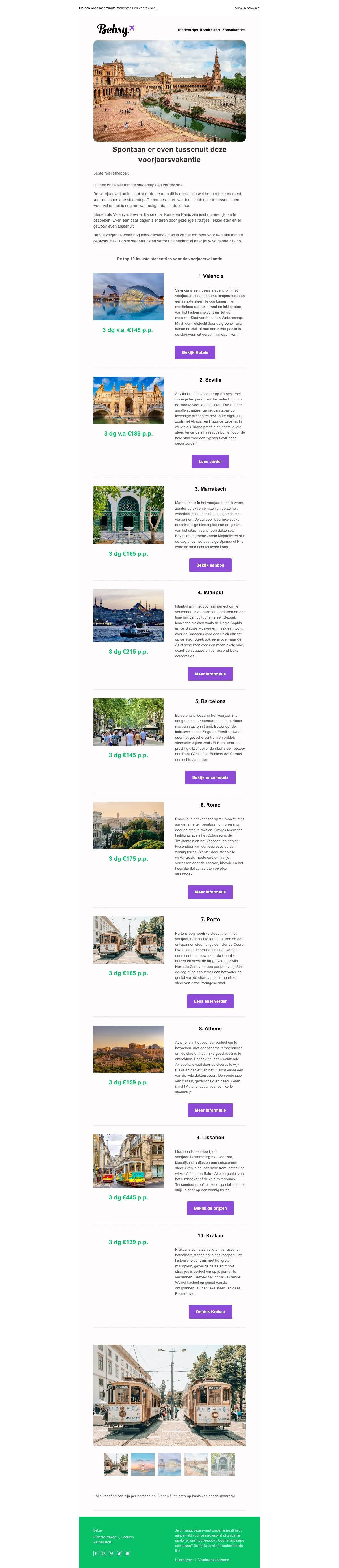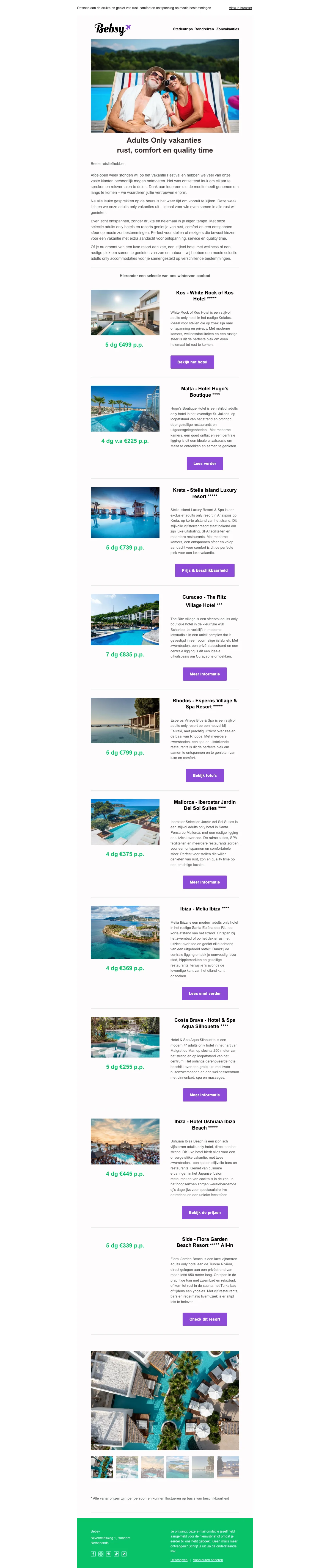 Vroegboekacties werken anders. Hier profiteer je van vaste kortingsbedragen wanneer je maanden vooruit boekt. Het voordeel is keuzevrijheid: je kiest exact de accommodatie, kamer en vertrekdatum die je wilt. Bebsy kondigt nieuwe vroegboekcodes aan via de nieuwsbrief, dus aanmelden is de eerste stap naar extra voordeel.