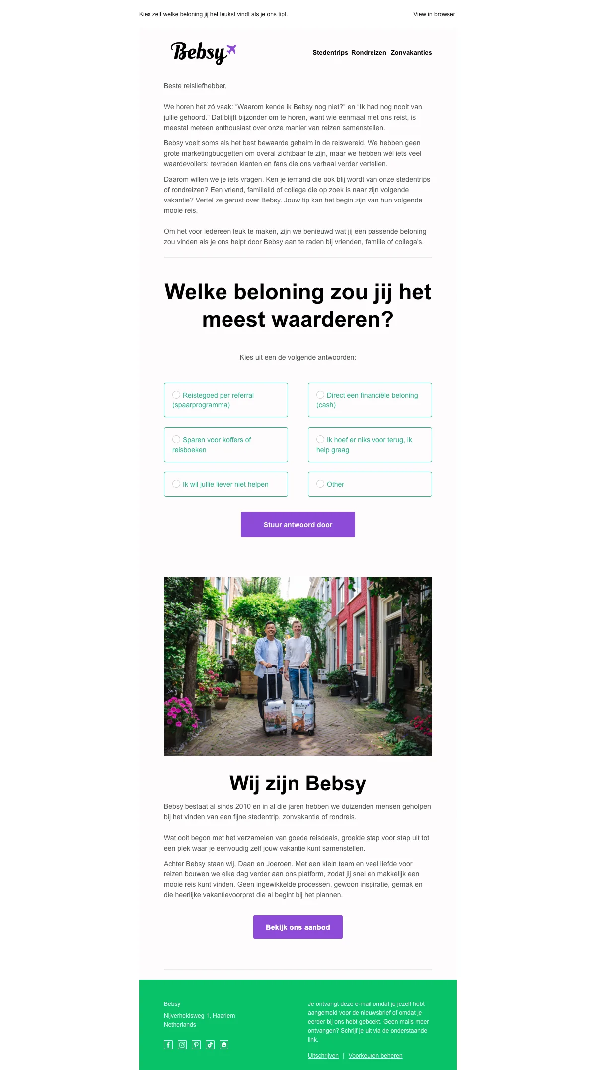 Kortingscodes bij Bebsy werken op vaste bedragen per boeking, zoals €25, €50 of €75 korting op specifieke bestemmingen of reistypes. Deze codes verschijnen rondom seizoensopeningen, nieuwe bestemmingen of speciale periodes zoals Black Friday. Voer de code in tijdens stap 2 van het boekingsproces, direct onder de verzekeringsopties. De korting wordt automatisch van je totaalprijs afgetrokken.