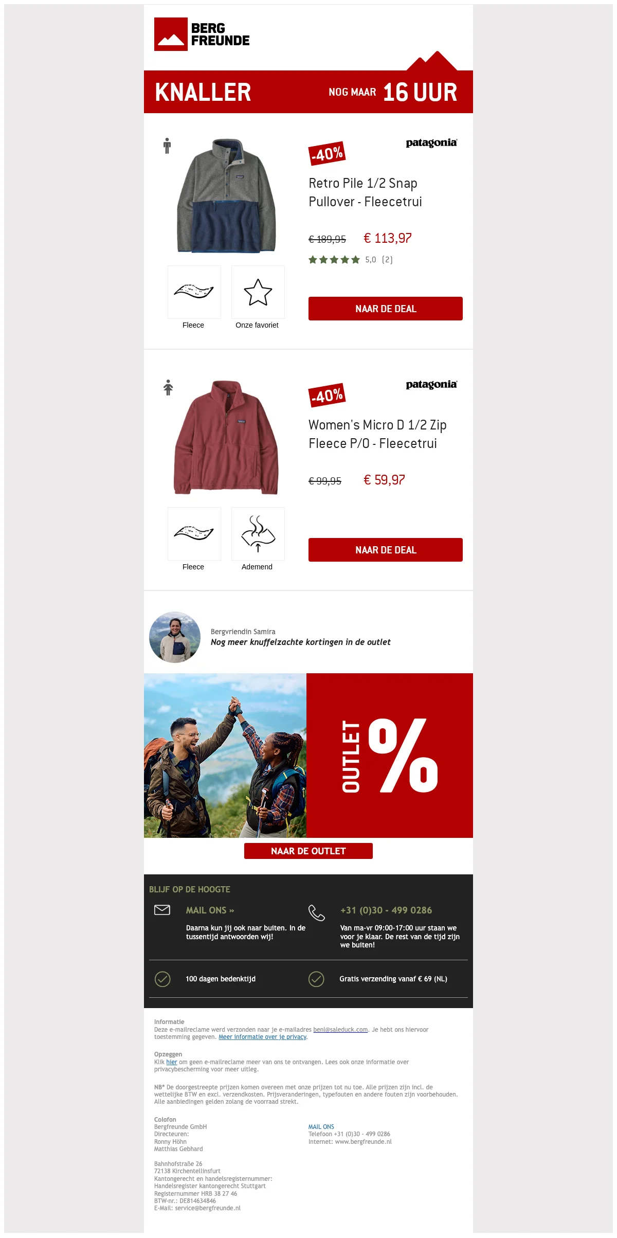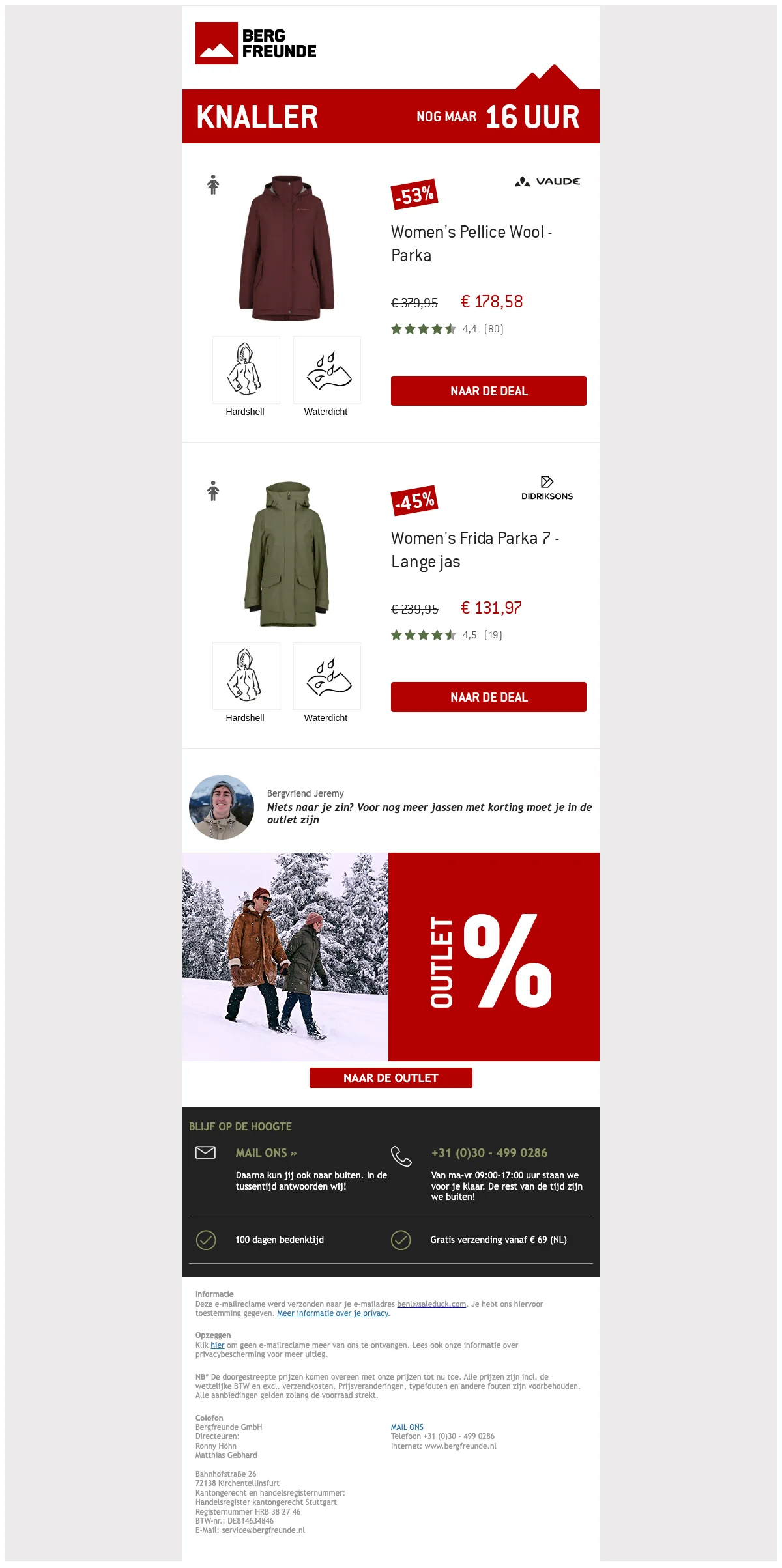 De eerste korting is snel verdiend bij Bergfreunde. Het enige wat je hoeft te doen is je in te schrijven op de nieuwsbrief. Dan word je niet alleen op de hoogte gehouden van de beste aanbiedingen, maar krijg je gelijk een code waarmee je €5 korting krijgt op je volgende bestelling.