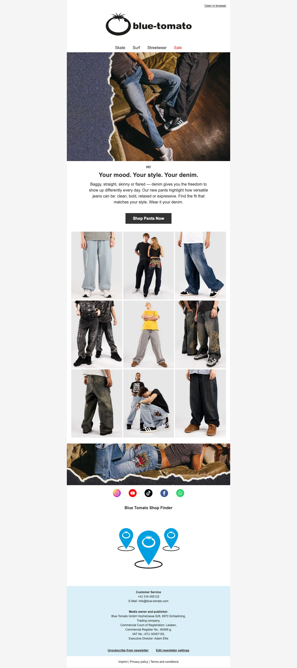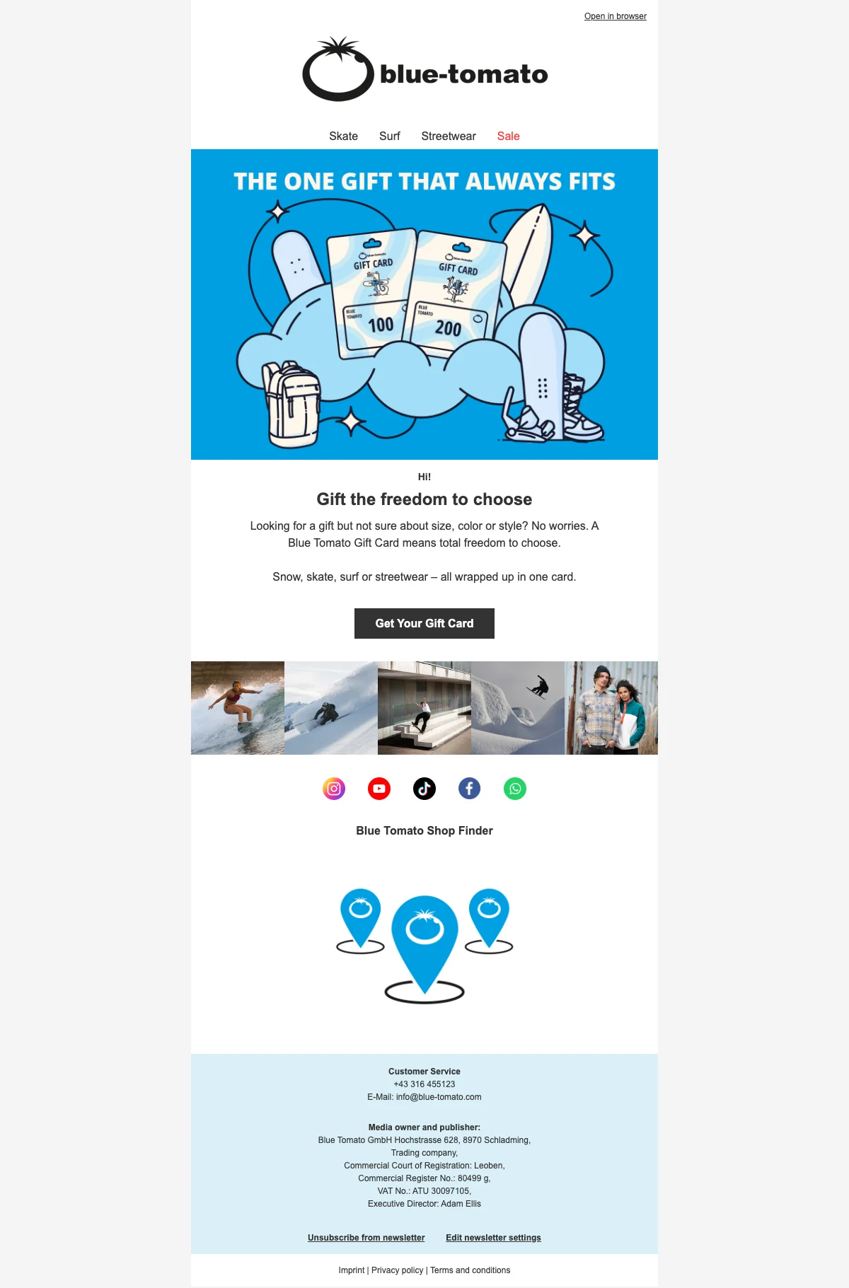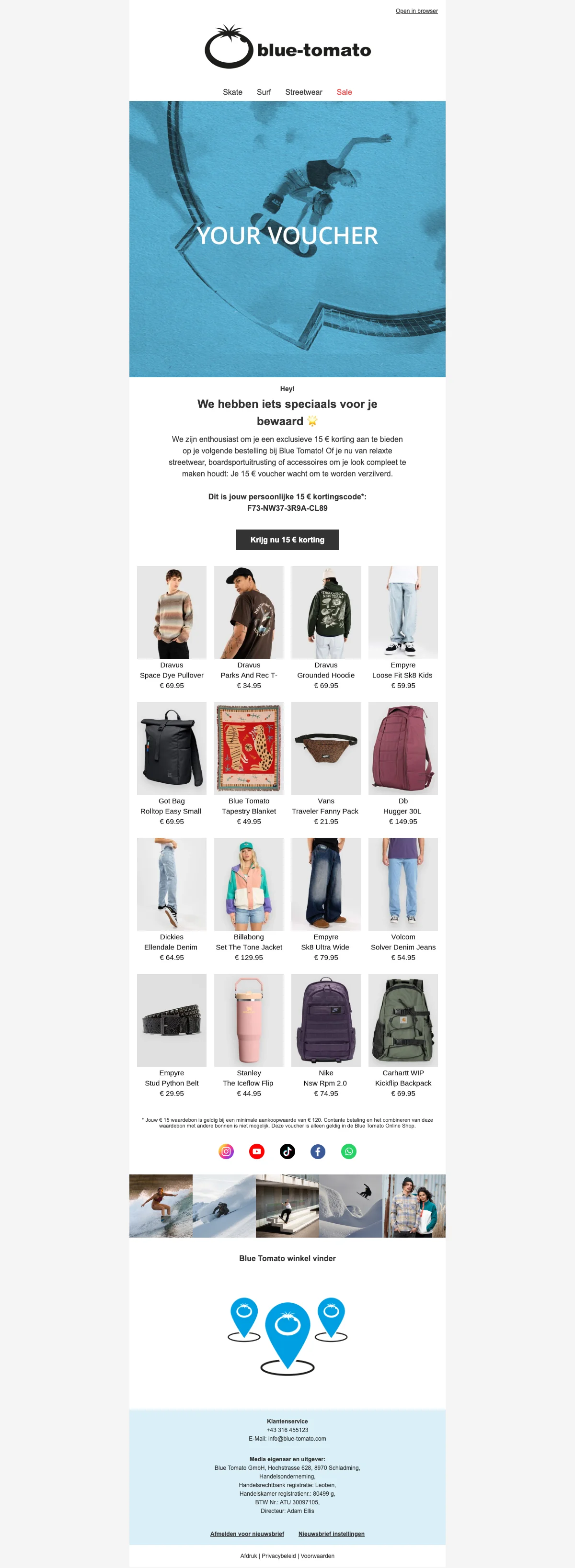 Schrijf u in een paar klikken in op de Blue Tomato-nieuwsbrief en ontvang uw eerste korting zodra u zich registreert! Dankzij deze nieuwsbrief kunt u de nieuwste producten ontdekken die voor iedereen online zijn gezet, zodat u geen enkele favoriet op de site hoeft te missen.