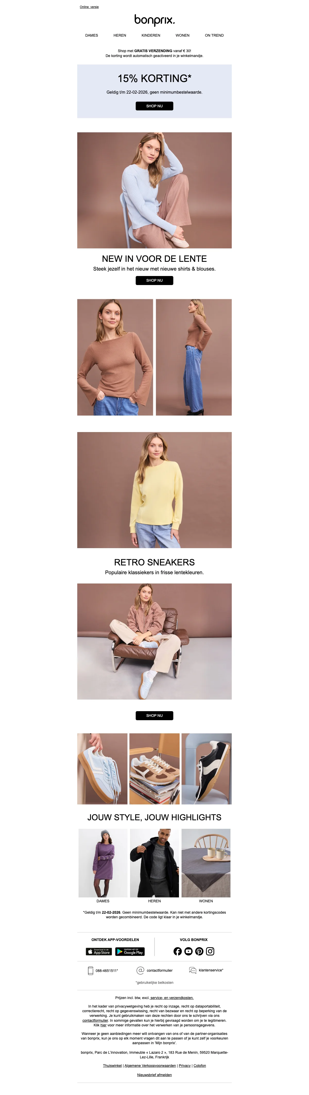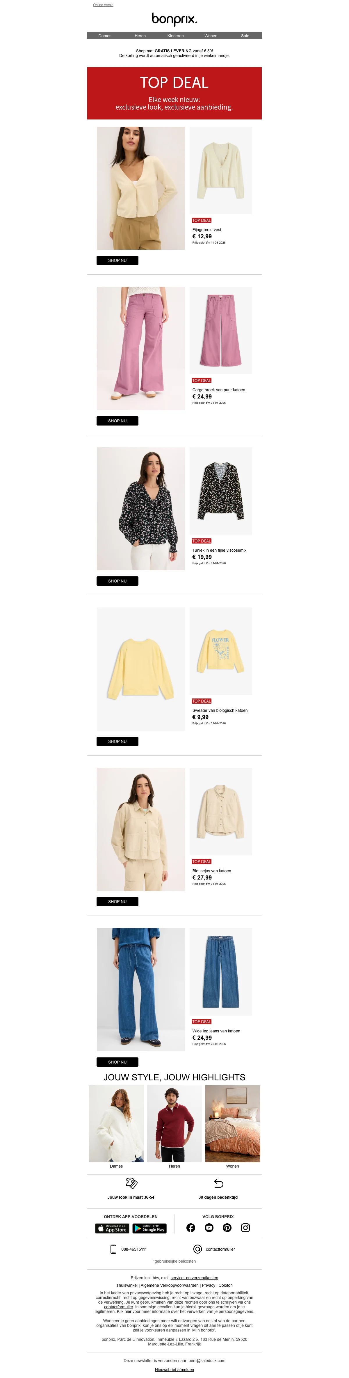 Het is een webwinkel die haar bezoekers van de mogelijkheid voorziet om een keuze te maken uit een uitgebreid aanbod aan verschillende kleren. Of je nu op zoek bent naar een stijlvolle jurk om mee naar een bal te gaan of je gewoon mooie lingerie wenst aan te kopen, je bent bij Bon Prix ongetwijfeld aan het juiste adres. Zoals de naam van de webwinkel reeds enigszins verraadt kun je bij Bon Prix ook altijd rekenen op een interessante en vooral lage prijs.