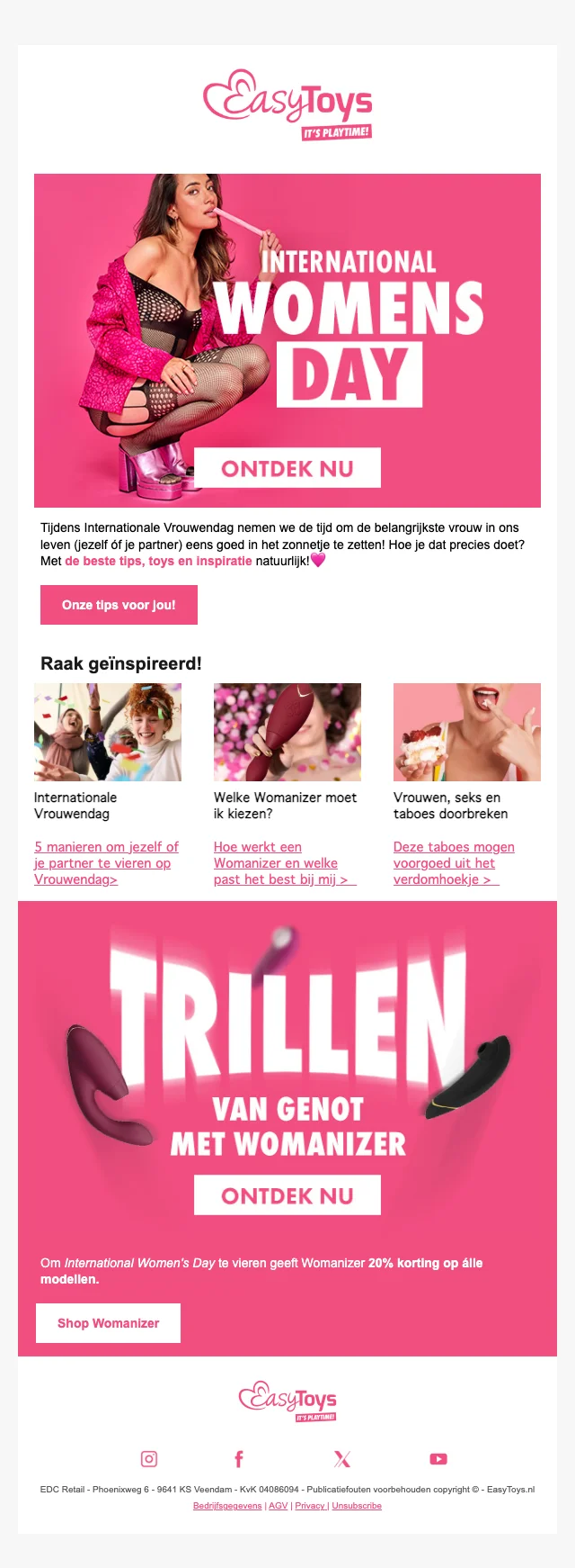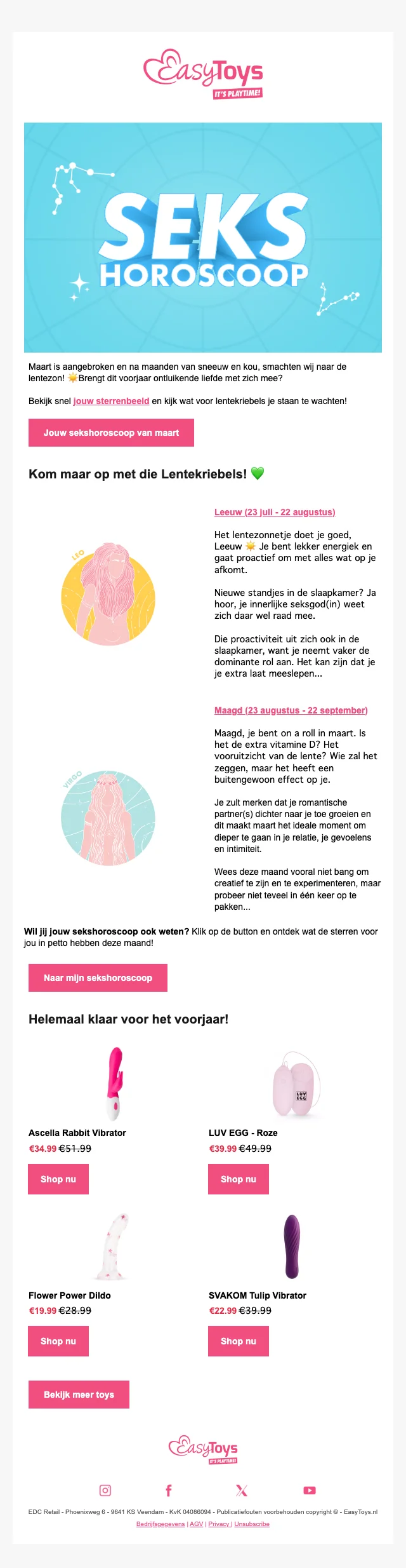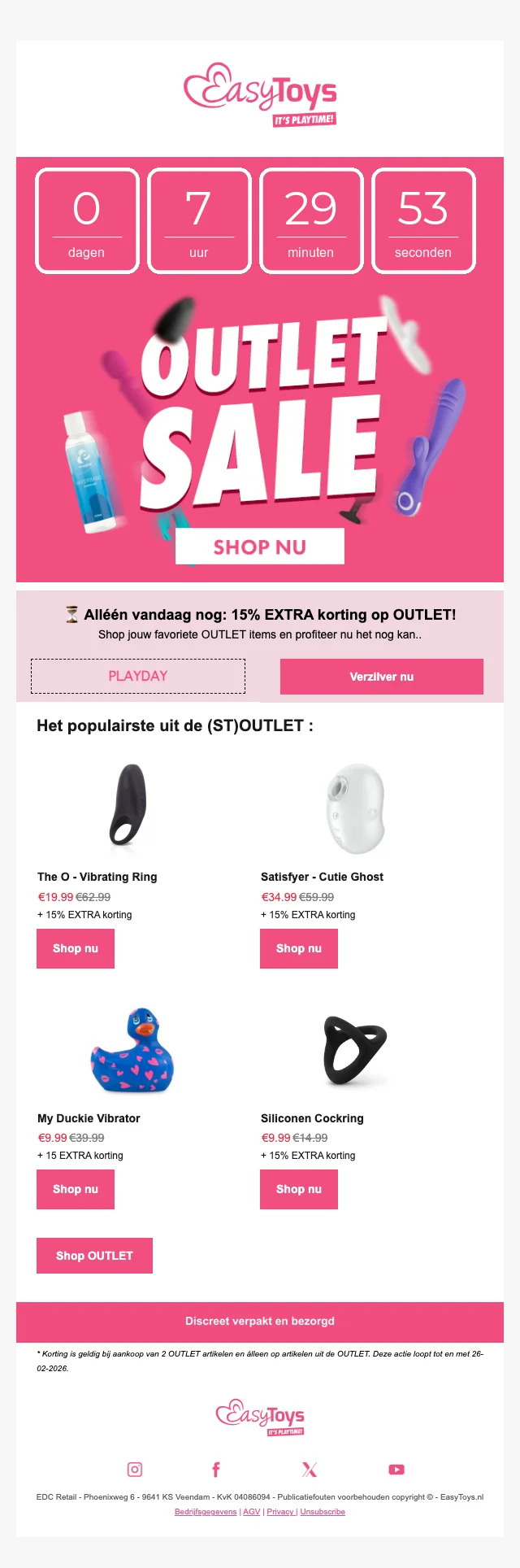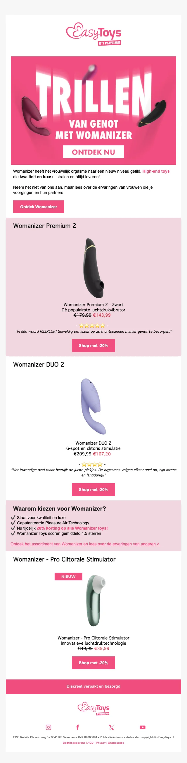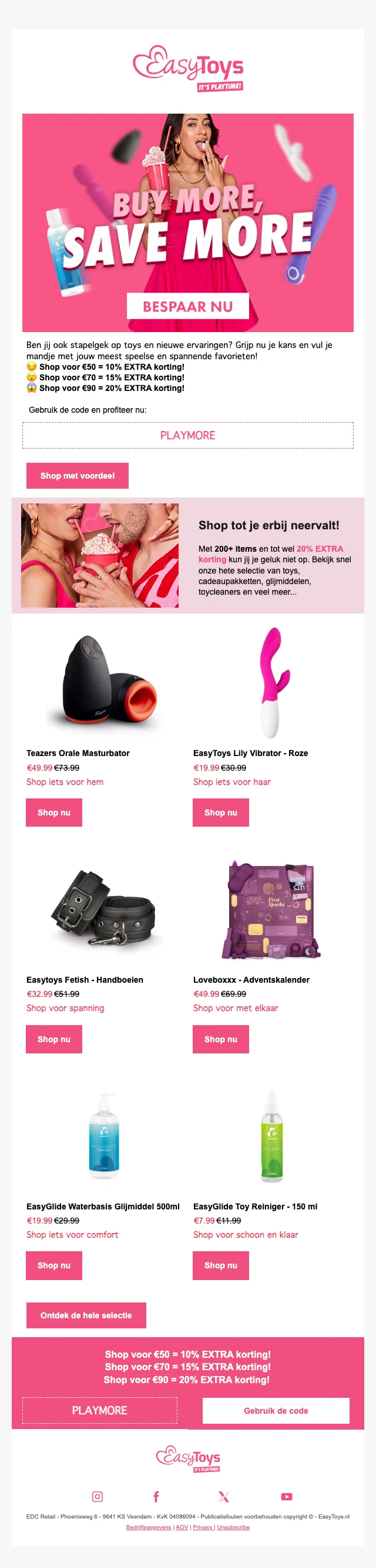 Bij EasyToys vind je de spannendste speeltjes voor volwassenen. In de sale geniet je deze maand van hoge kortingen die oplopen tot wel 35%. Verwen jezelf of een ander met een nieuwe vibrator, dildo, buttplug of kunstvagina. Voor degenen die zich graag helemaal overgeven of een ander willen domineren zijn er verleidelijke bondage producten en sexy zweepjes. Kortom: wacht niet te lang en neem gauw even een kijkje bij de webwinkel.