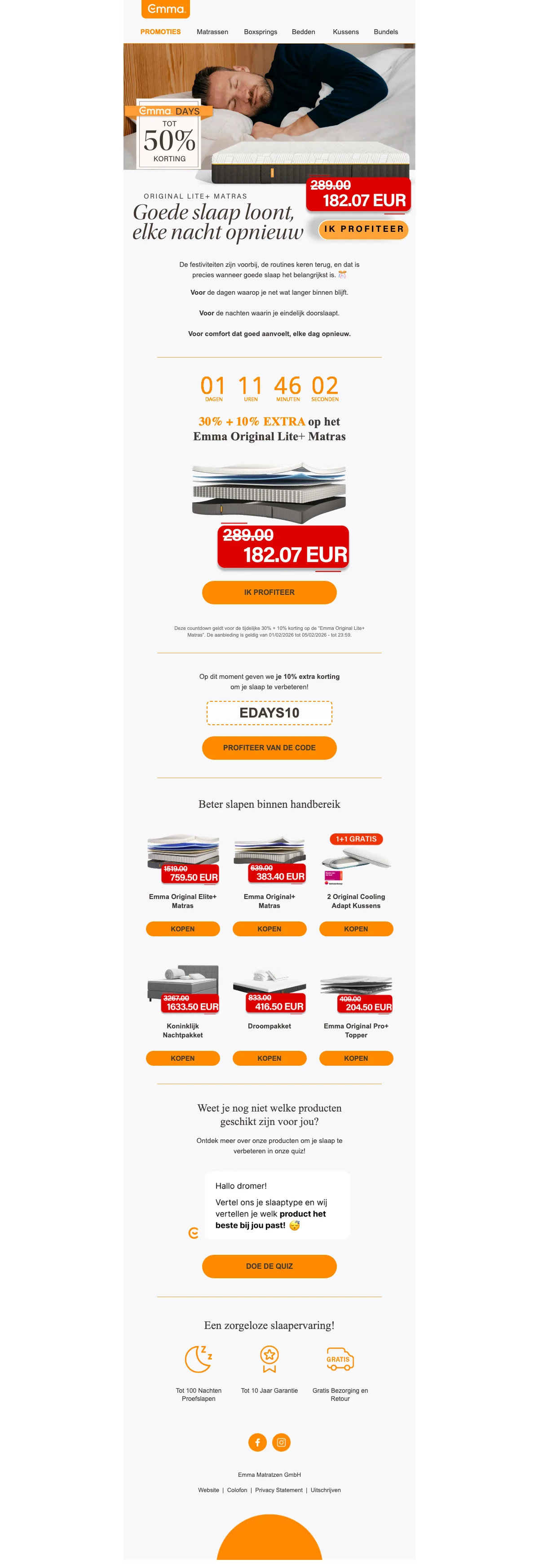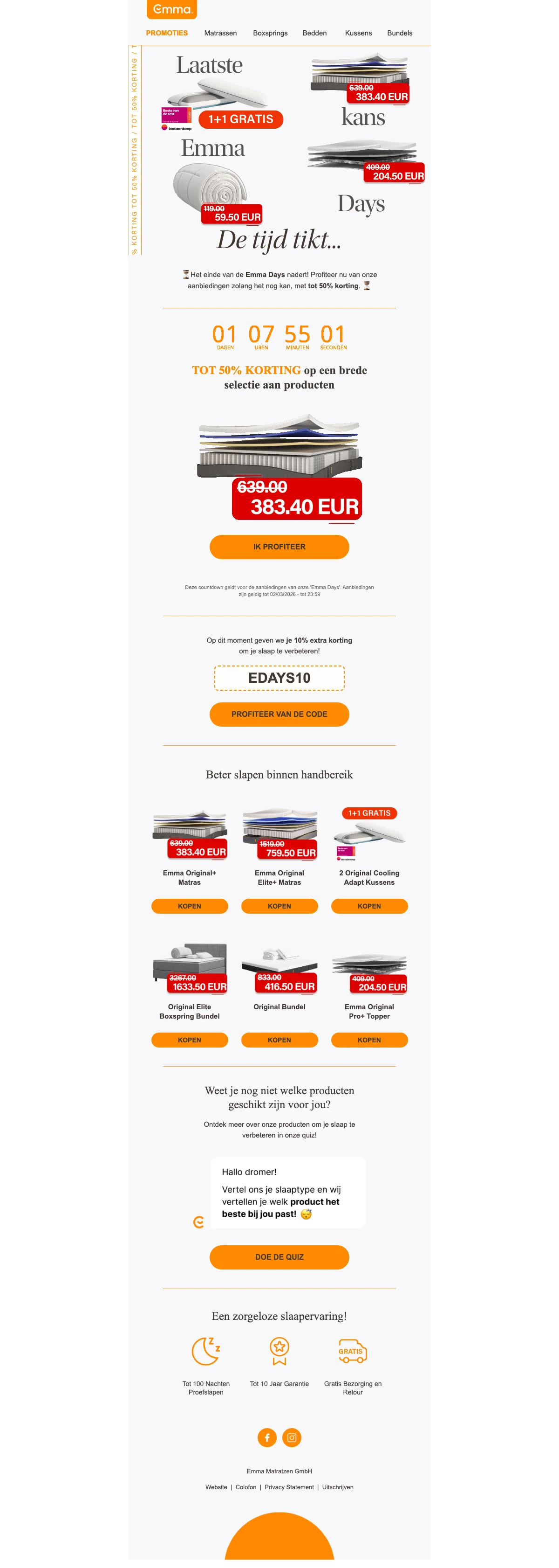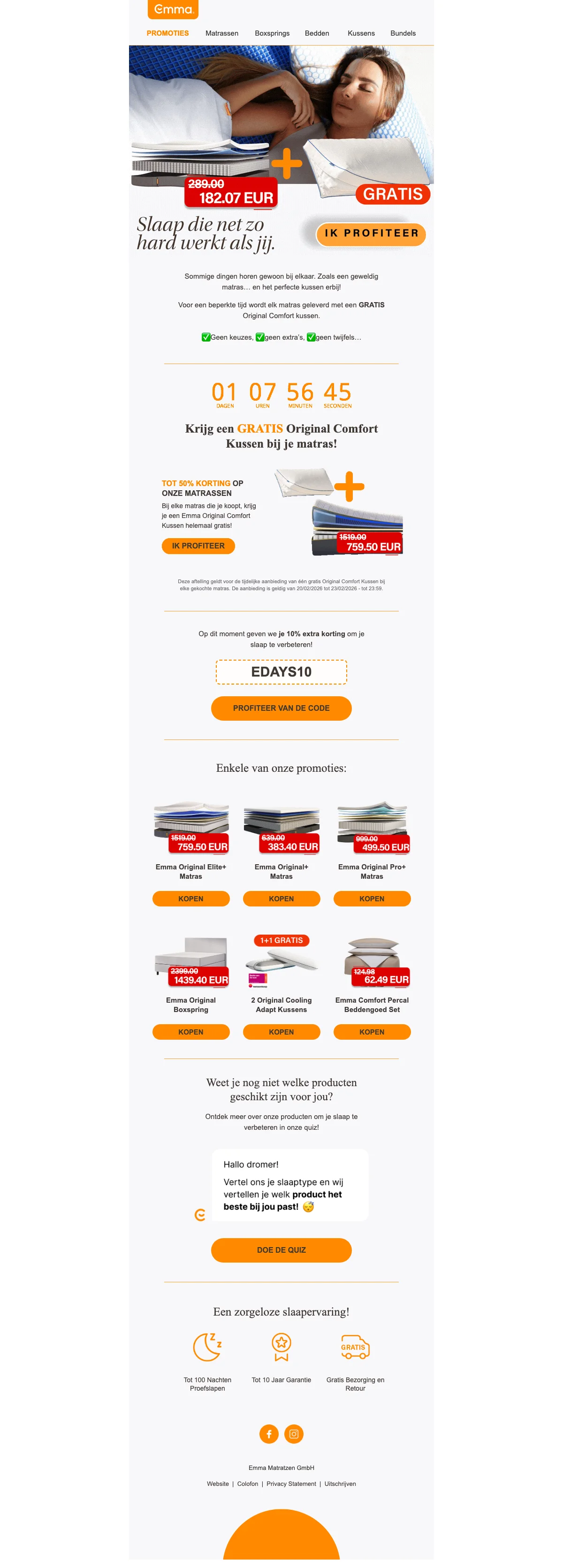 Emma Matras staat in op de internationale markt bekend om hun matrassen en de wel bekende reclames die in je hoofd blijven zitten. Emma Matras is een bedrijf dat niet altijd groot is geweest. Het bedrijf is opgericht in december 2015 in Duitsland. Laatste 2 jaar is het merk enorm gegroeid, door speciale technieken en nieuwe ontwerpen ontwikkeld Emma Matras een nieuwe comfort voor op uw bed. Emma Matras heeft als visie en doel een matras te ontwikkelen dat voor ieder lichaamstype ultieme comfort biedt, zoals haar naam al zegt staat Emma Matras bekend om haar matrassen. Echter verkopen de Emma Matras winkels ook kussens en bedden. Ook heeft Emma Matras accessoires ontwikkeld zodat ze de complete slaap comfort kunnen bieden voor u.