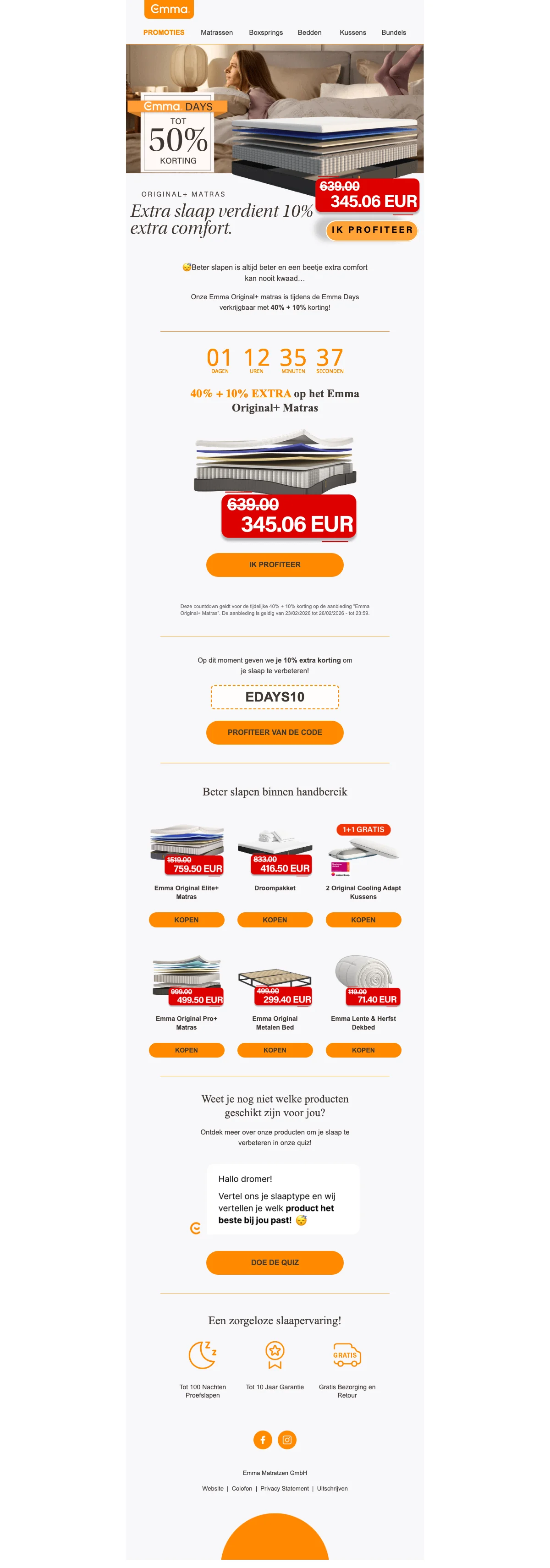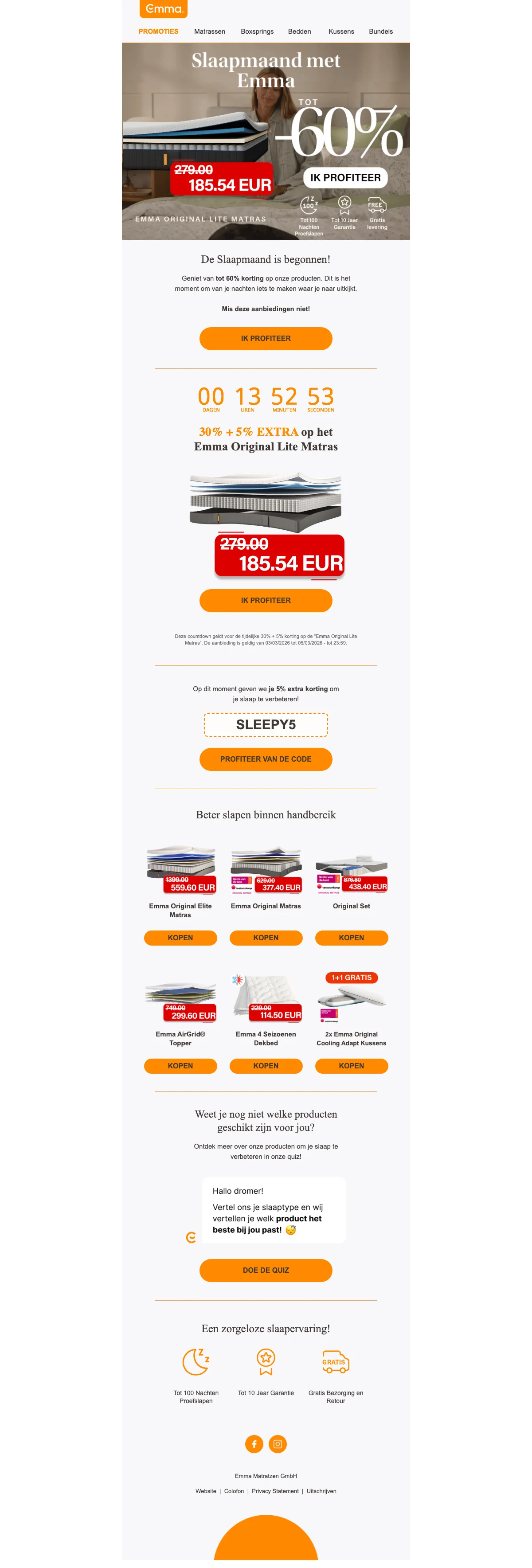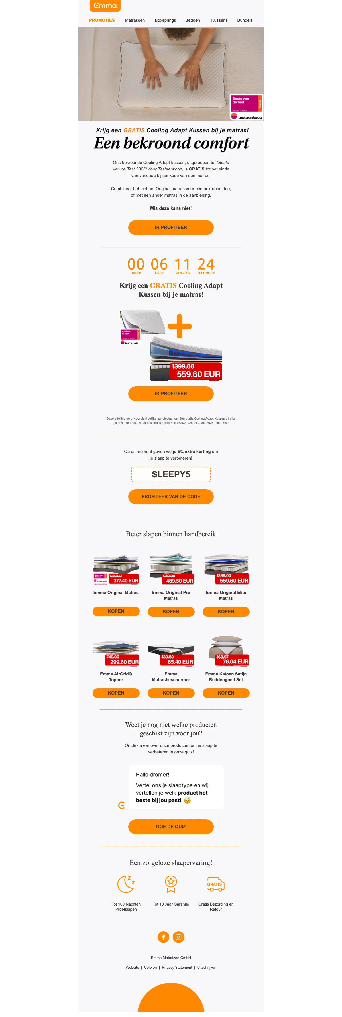 Emma Matras staat in op de internationale markt bekend om hun matrassen en de wel bekende reclames die in je hoofd blijven zitten. Emma Matras is een bedrijf dat niet altijd groot is geweest. Het bedrijf is opgericht in december 2015 in Duitsland. Laatste 2 jaar is het merk enorm gegroeid, door speciale technieken en nieuwe ontwerpen ontwikkeld Emma Matras een nieuwe comfort voor op uw bed. Emma Matras heeft als visie en doel een matras te ontwikkelen dat voor ieder lichaamstype ultieme comfort biedt, zoals haar naam al zegt staat Emma Matras bekend om haar matrassen. Echter verkopen de Emma Matras winkels ook kussens en bedden. Ook heeft Emma Matras accessoires ontwikkeld zodat ze de complete slaap comfort kunnen bieden voor u.