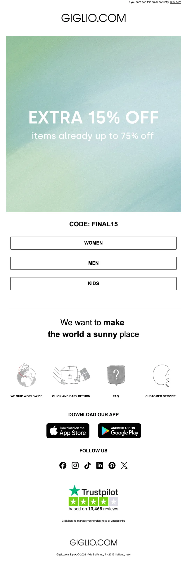 | FINAL15 | Giglio kortingscode: 15% extra korting op sale-items voor dames en heren |