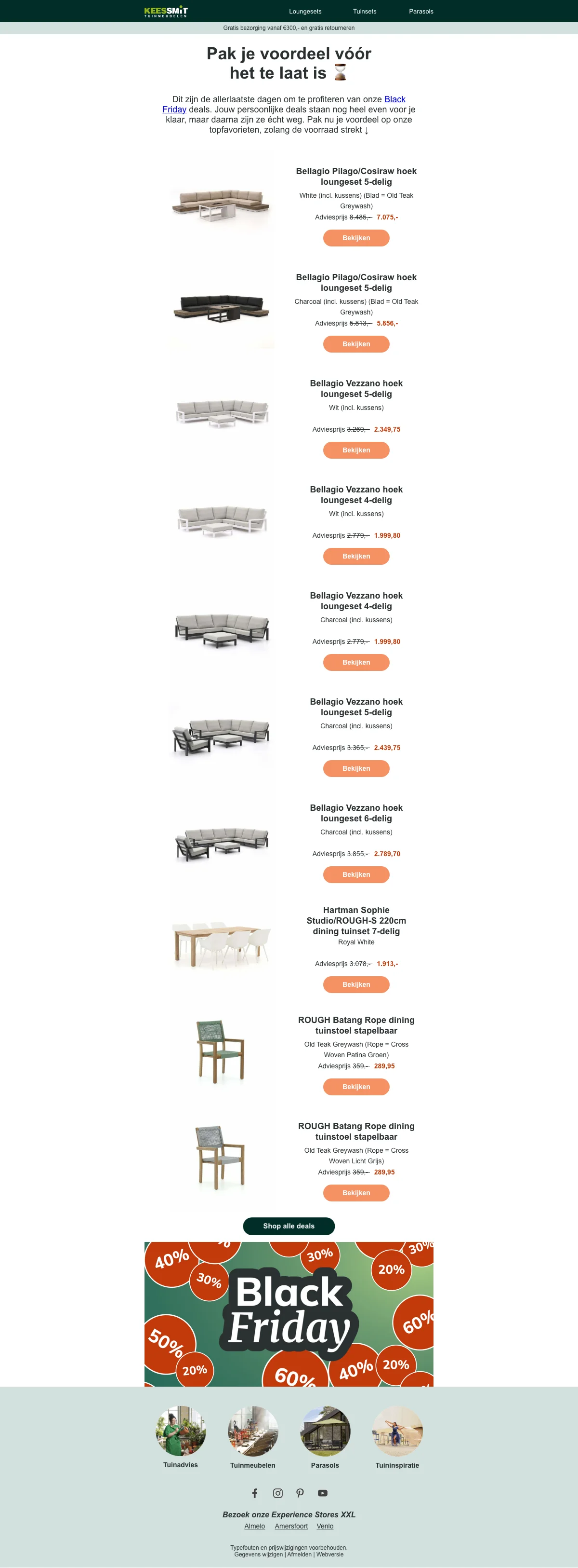 Bij Kees Smit tuinmeubelen vind je voor de beste prijs jouw nieuwe tuinmeubelen en andere items voor in jouw tuin! Ga snel naar de webshop en bekijk het zeer uitgebreide assortiment. Bestel je voor € 150 of meer? Dan profiteer je van gratis bezorging!
