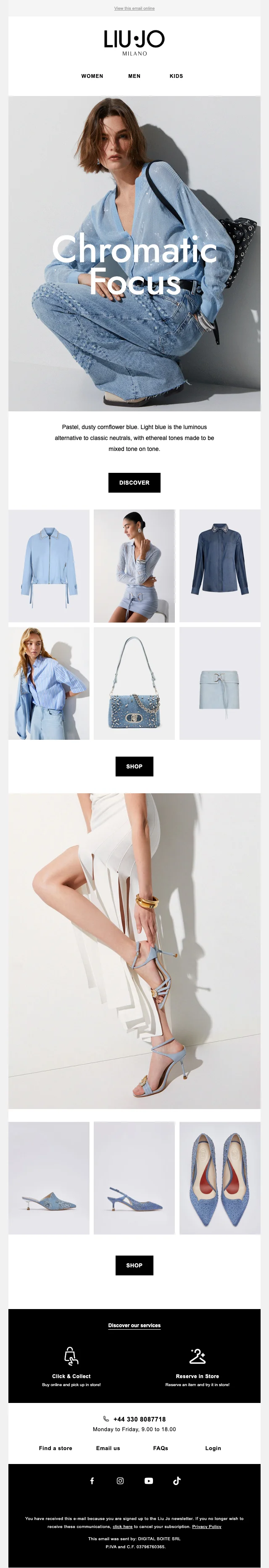 Ontdek de vele aanbiedingen van webshop Liu Jo. In de webshop vind je elegante kleding voor de vrouw, maar ook een groot assortiment aan schoenen en accessoires. Bestel nu de frisse nieuwe collectie tegen de scherpste prijs.