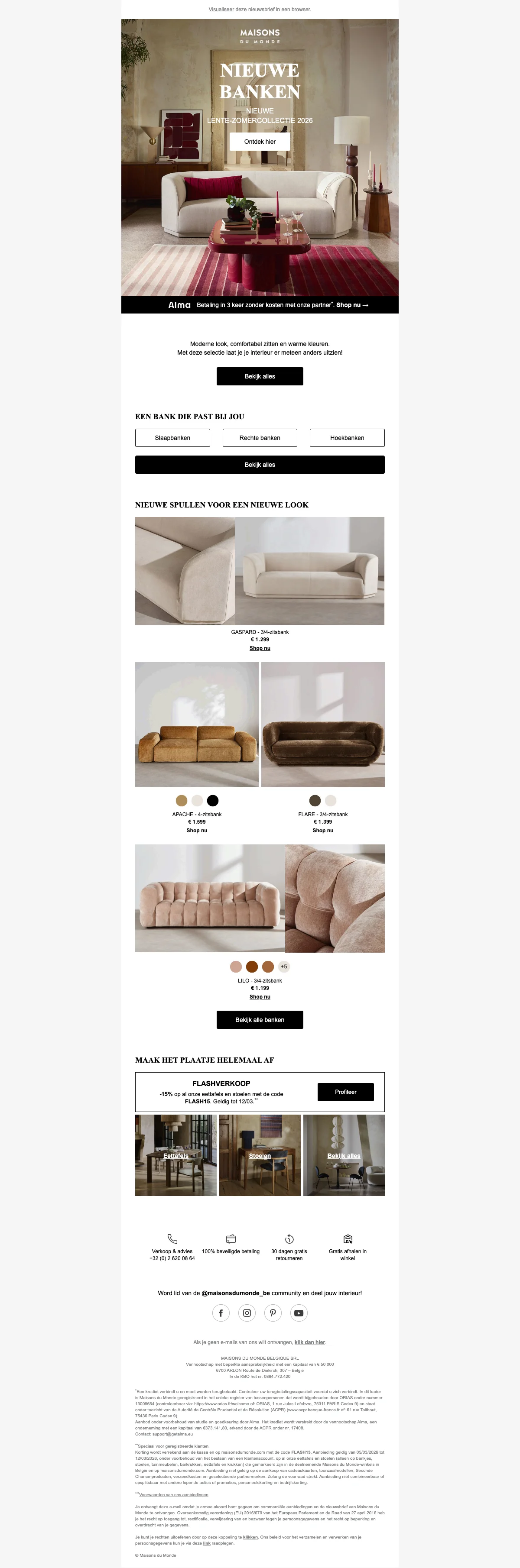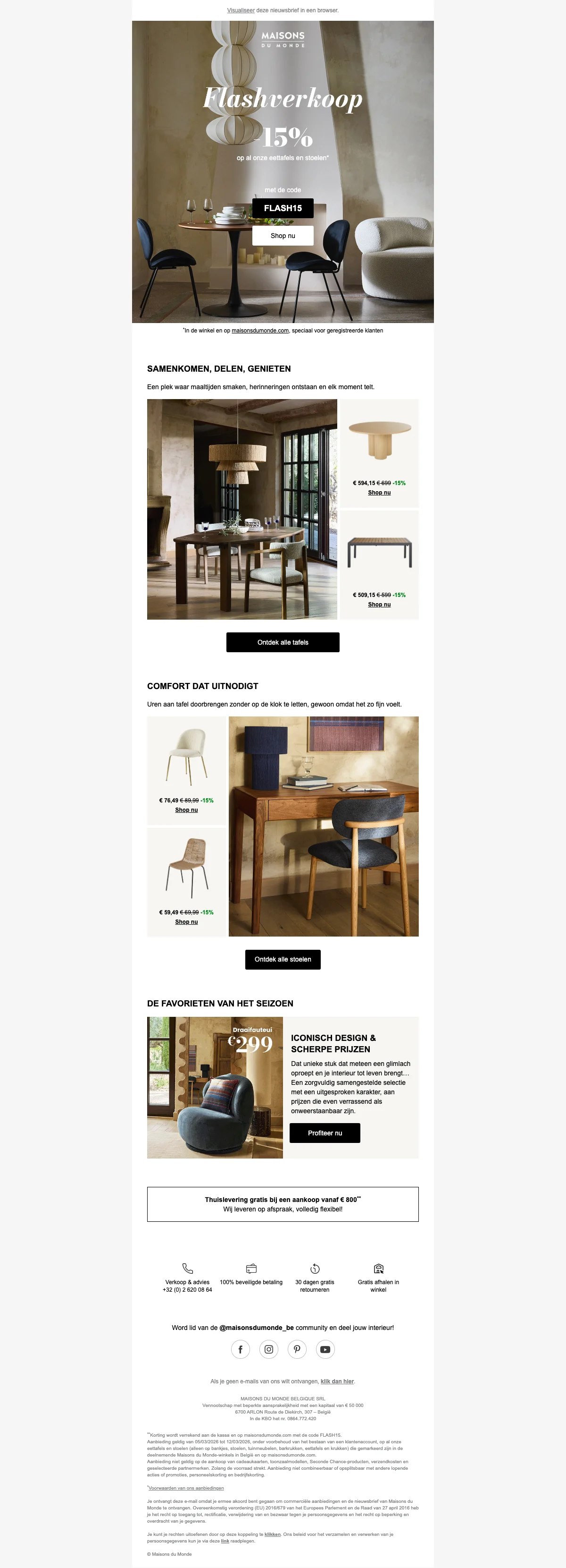 De Maisons du Monde kortingscode is FLASH15. Vul onze code voor Maisons du Monde 2026 in op de afrekenpagina en ontvang exclusieve kortingen. Maisons du Monde flashverkoop: eettafels en stoelen 15% korting.