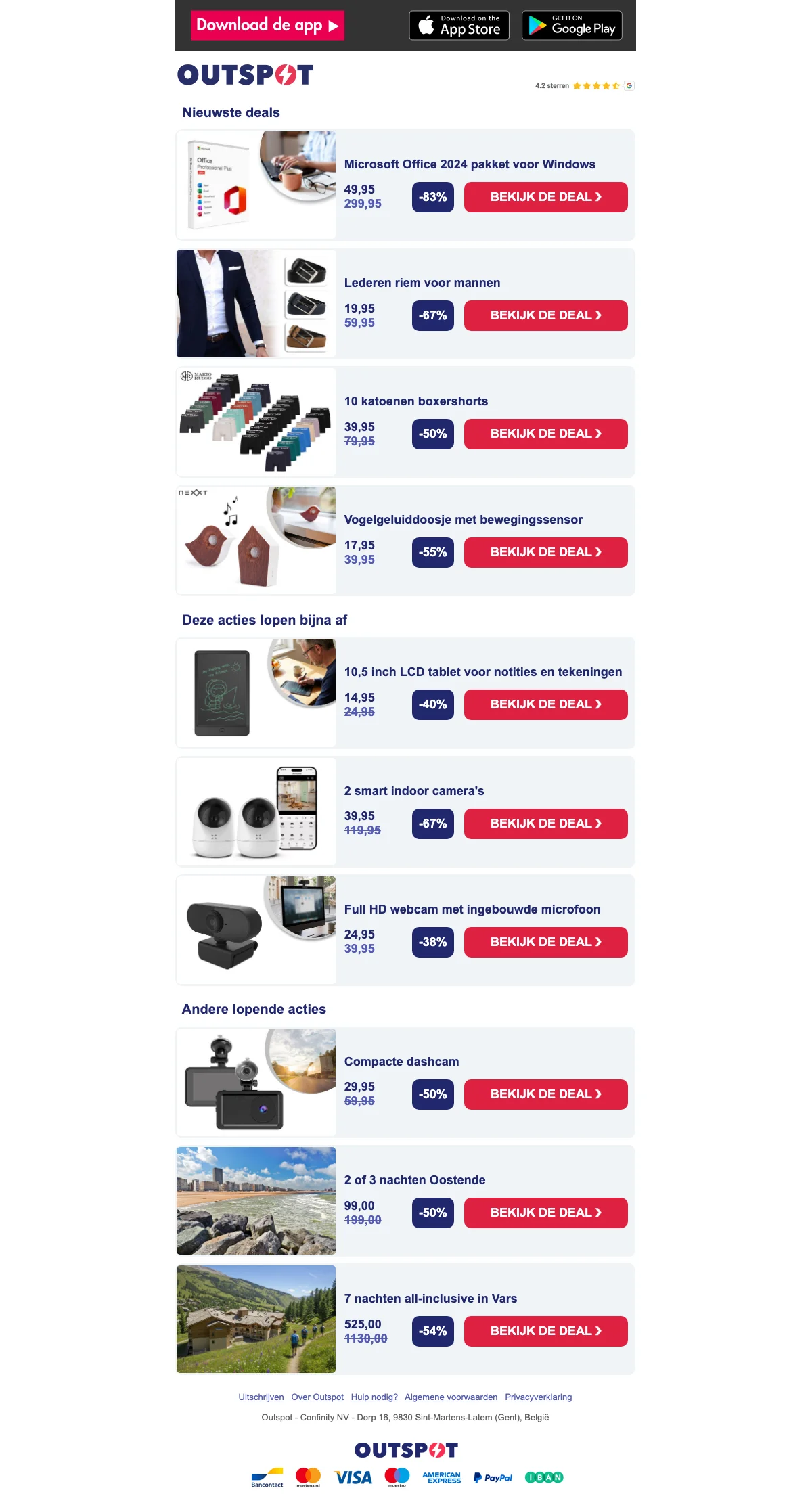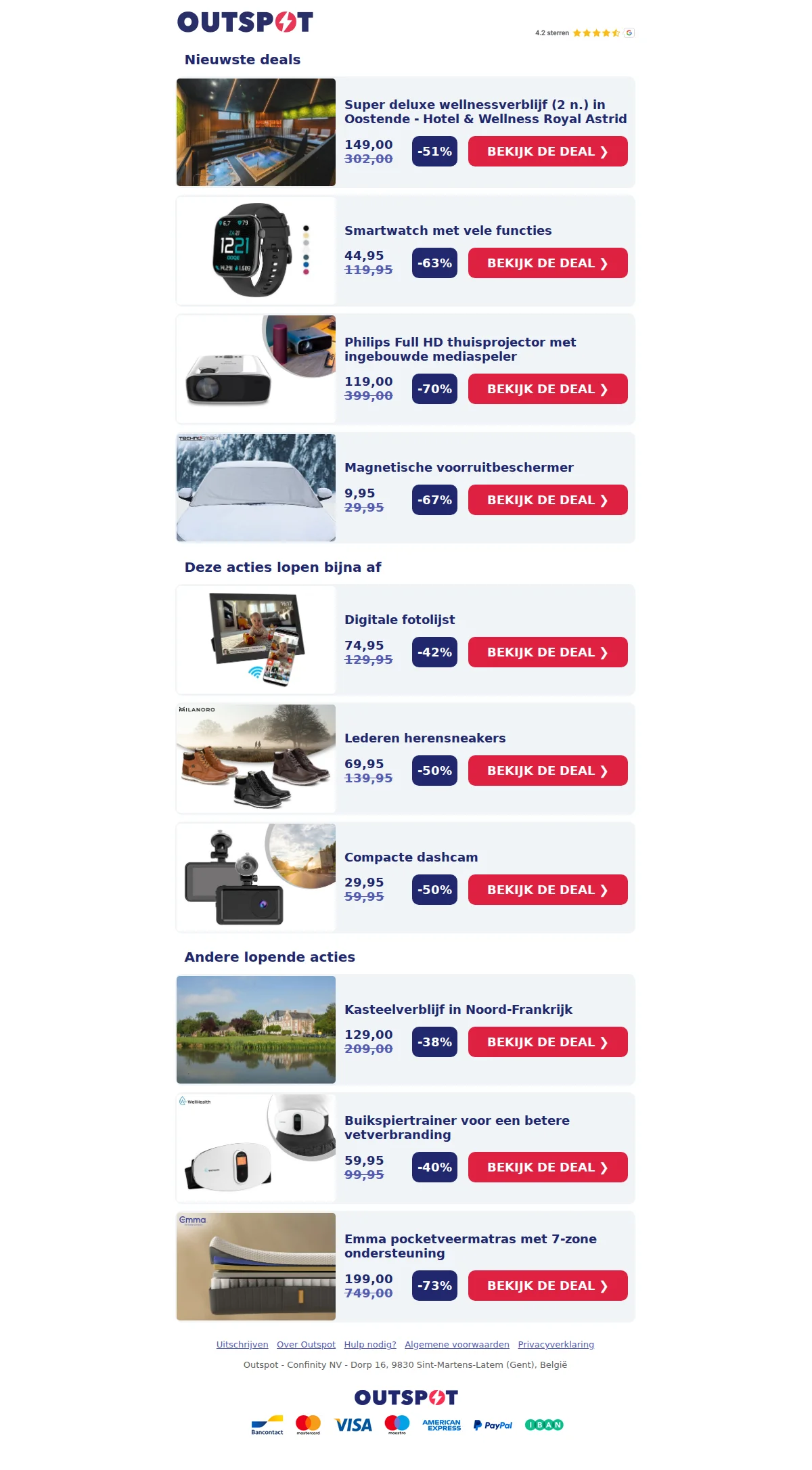 Bij Outspot zijn altijd leuke deals te vinden, soms voor reizen of een dagje weg, maar ook om lekker een keer uit eten te gaan. Deze deals worden ook wel de onweerstaanbare restaurantdeals genoemd. Dankzij deze deals kunt u goedkoop genieten van een heerlijke maaltijd op een gezellige locatie in een mooi restaurant. Denk bijvoorbeeld aan alle leuke restaurants in Antwerpen, Brugge of Brussel. Voor al deze plekken zijn vaak wel deals te vinden bij Outspot. Bekijk direct het gehele aanbod en ga ook voordelig uit eten!
