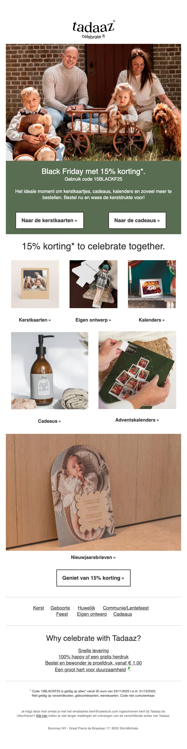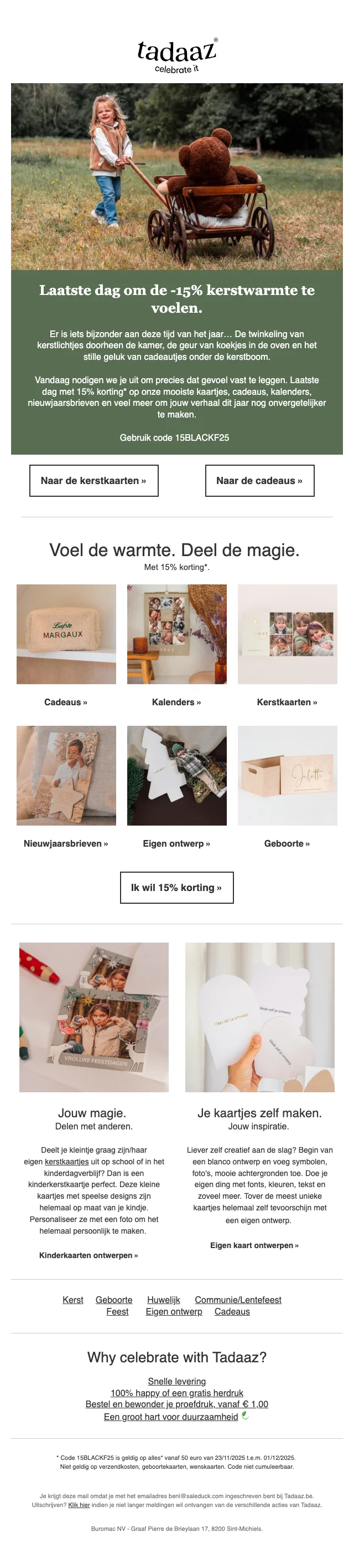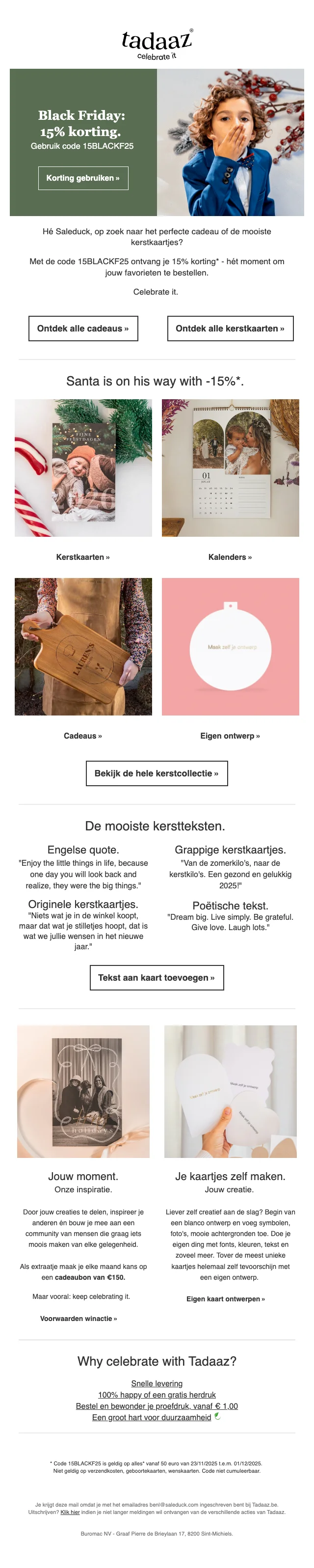 Voor bedrijven of andere organisaties is Tadaaz ook de perfecte plek om professionele kaarten te sturen naar medewerkers of klanten. Een bedrijfsfeest? Nieuwe milestone vieren? Kerst? Stuur bijvoorbeeld een uitnodiging met een leuke teamfoto, of integreer je logo en branding in je kaart voor extra naambekendheid voor je bedrijf. Zo zet je jouw zaak in de spotlight en het vergroot het samenhorigheidsgevoel van je werknemers.