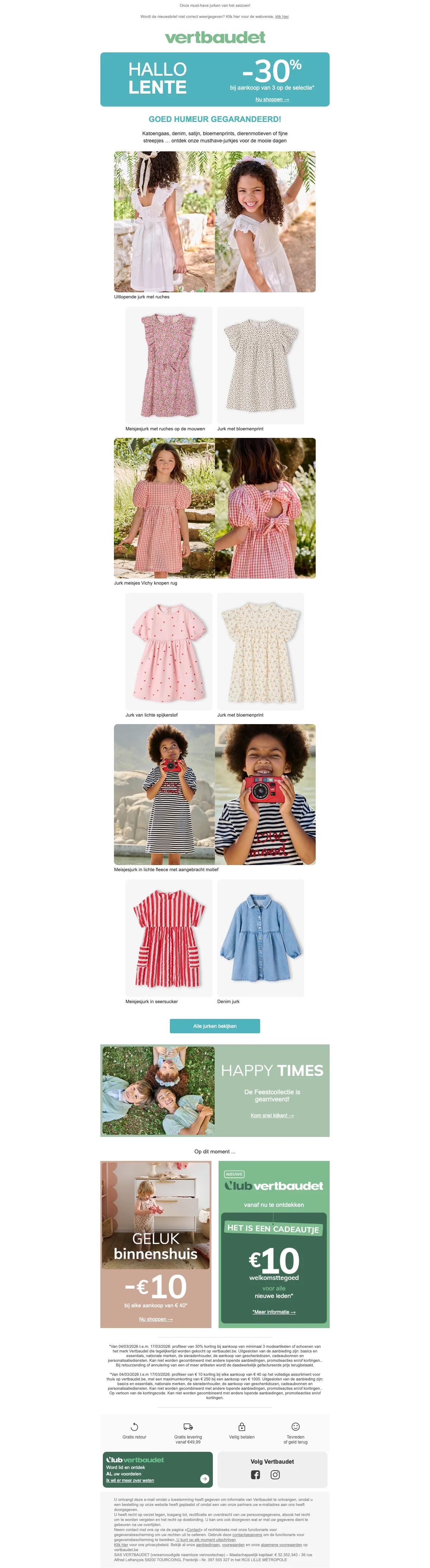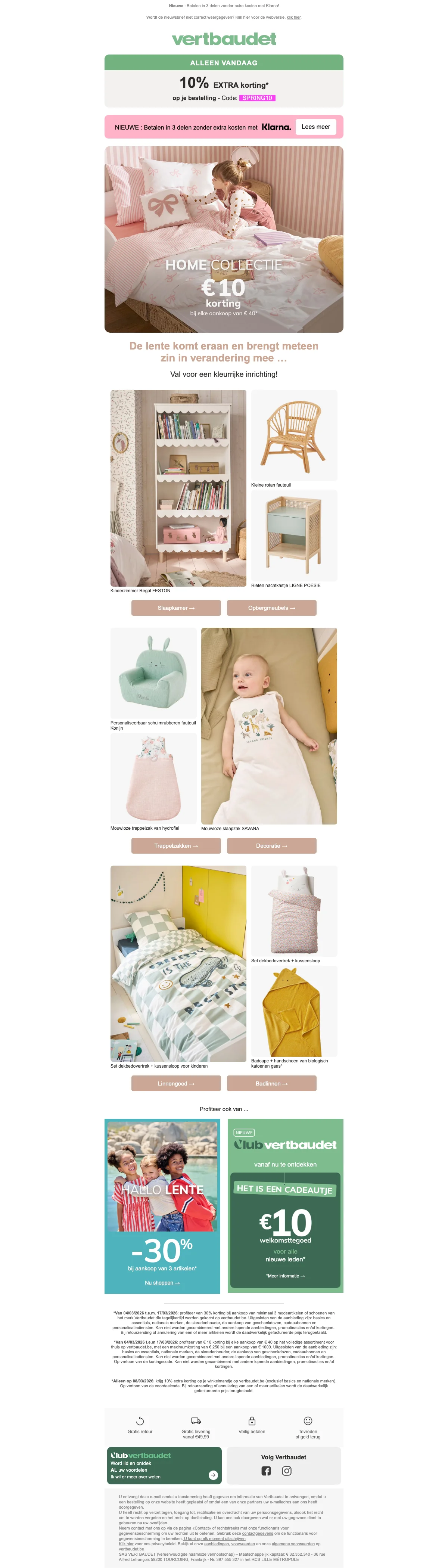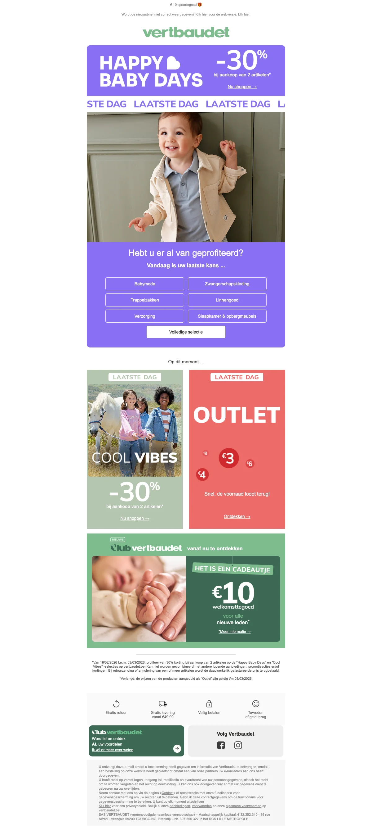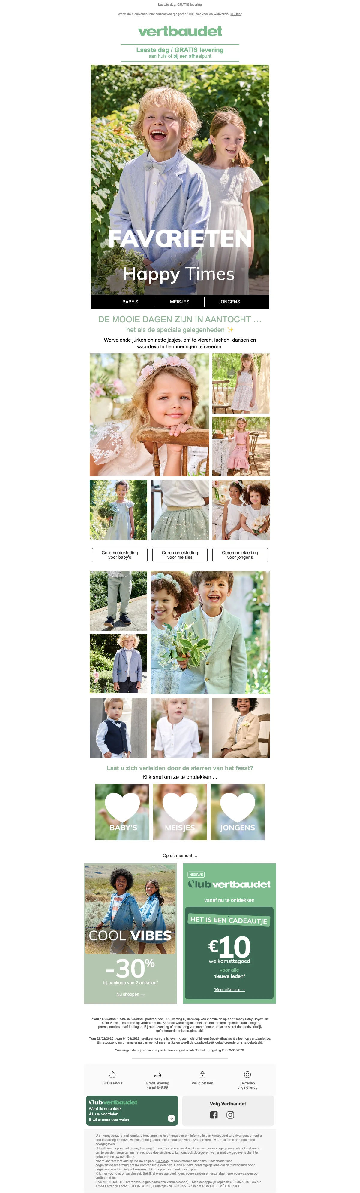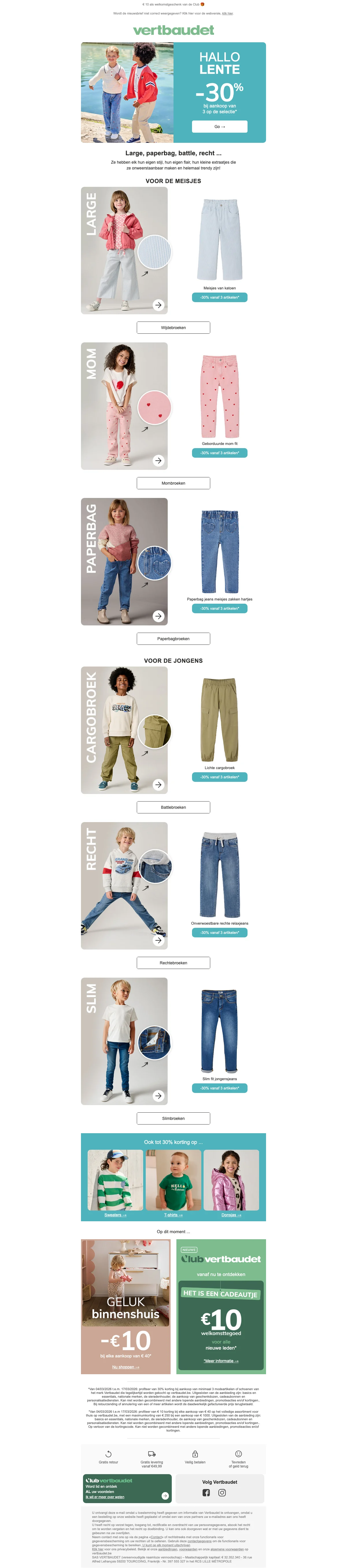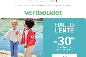 Ontvang €10 korting op je bestelling bij Vertbaudet; de korting wordt direct verrekend bij het afrekenen. Bekijk de actievoorwaarden op de website voor meer details over toepasselijkheid.