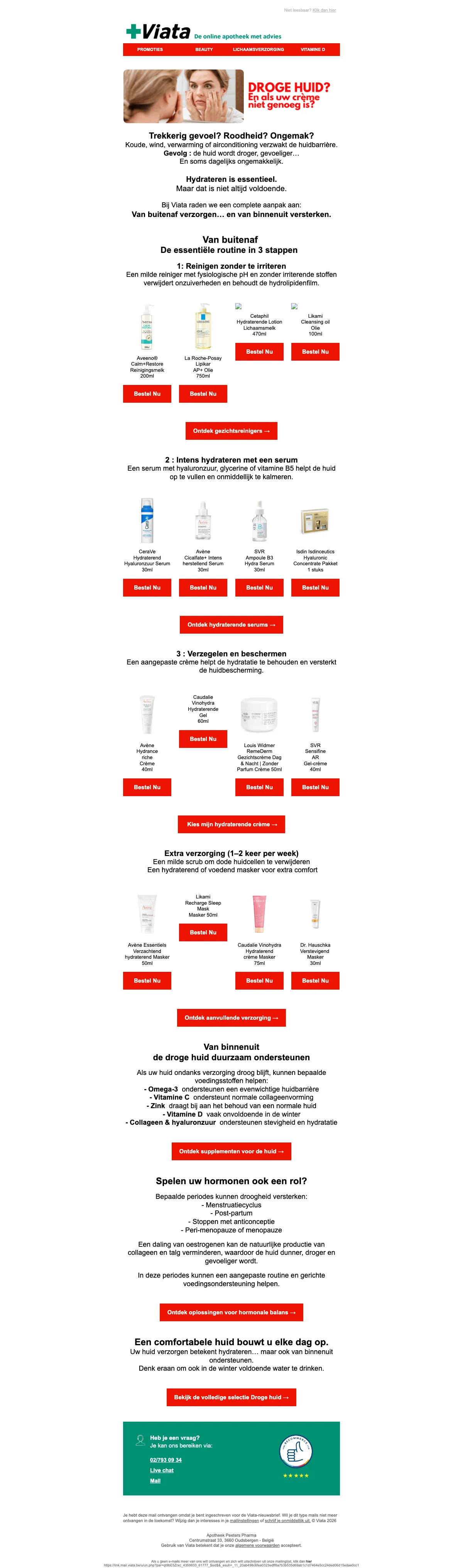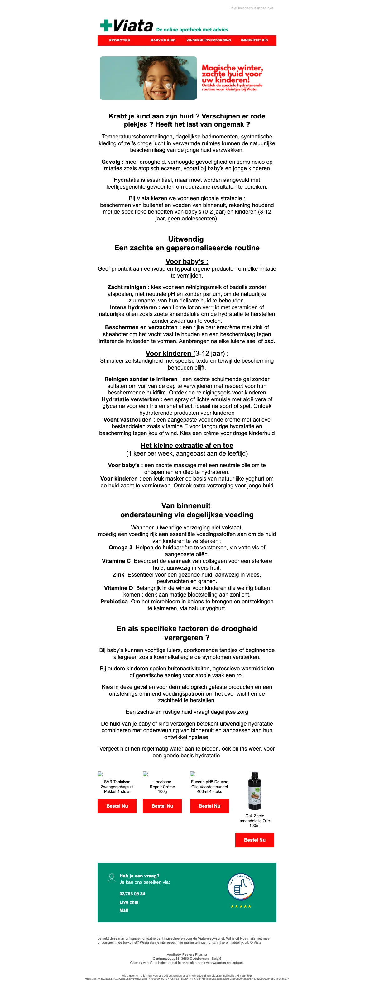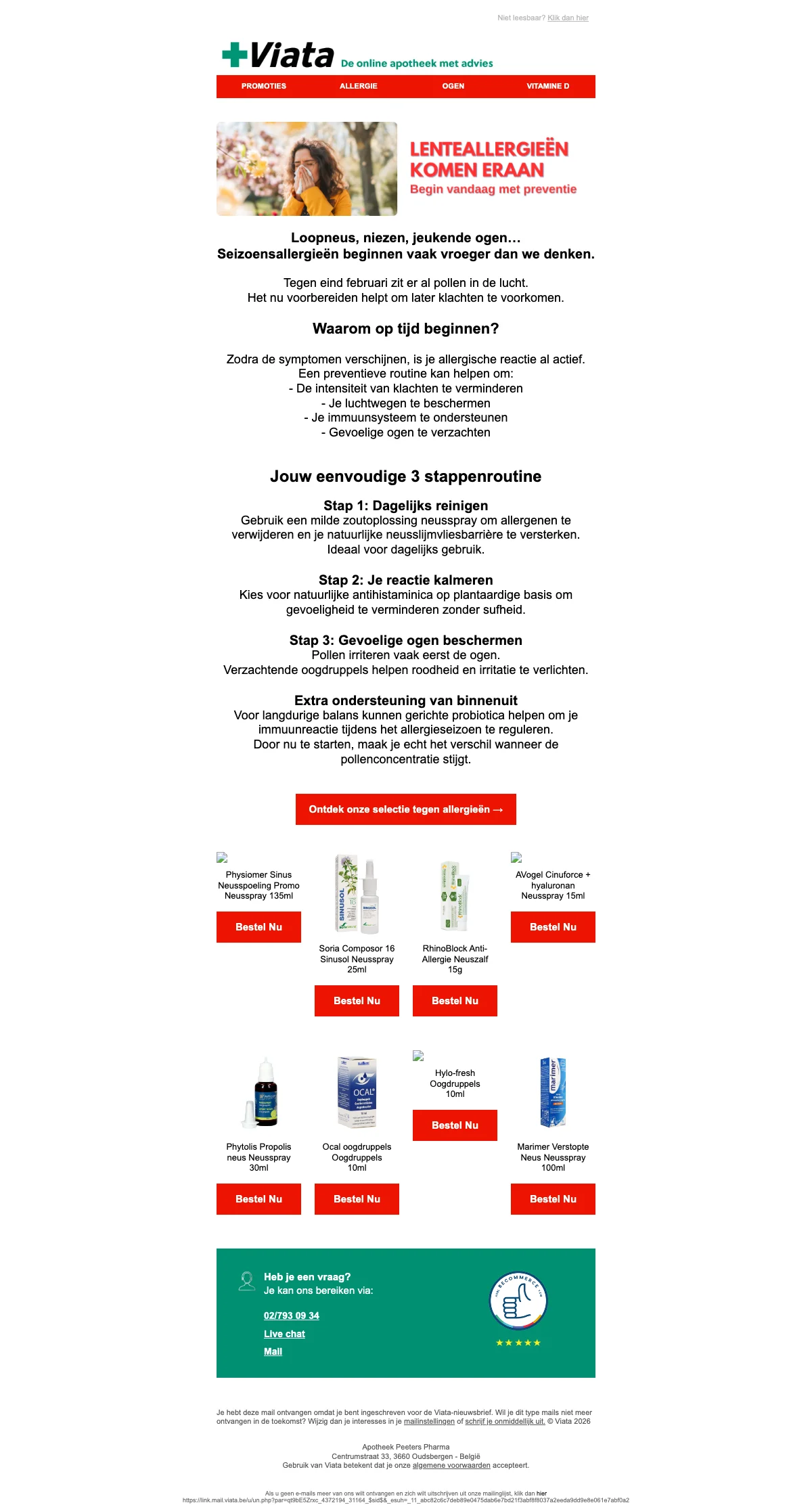 Viata is een apotheek gevestigd in België, dit is een online apotheek waar ze verschillende artikelen verkopen voor uw gezondheid. Bij Viata staat gezondheid op nummer 1, het is daarom ook dat zij goed luisteren naar de klant voor dat ze hem of haar echt goed kunnen helpen. Gezien Viata een online webwinkel is kunnen ze ervoor zorgen dat u de producten snel in huis hebt en blijft de winkel elk moment van de dag beschikbaar. Online kunt u kletsen met de medewerkers van Viata tijdens het shoppen op de webshop, zo kunt u vragen stellen of om advies vragen over het gebruik van sommige producten. De medewerkers staan elk moment van de dag klaar om naar u te luisteren en een zo goed mogelijk advies te geven. Viata heeft een ruim assortiment. Het gaat van medicatie naar huid en haar producten. Ook heeft Viata verschillende producten die u niet kunt consumeren dit zijn bijvoorbeeld stijltangen en föhns,