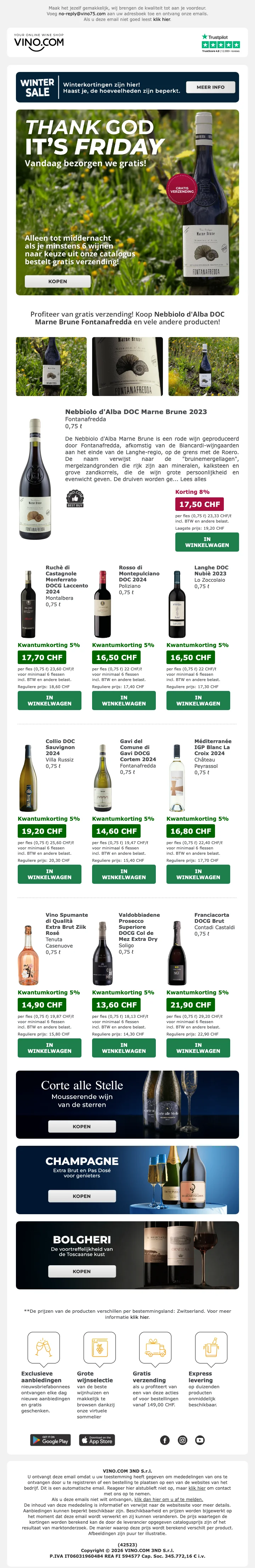 Bent u nieuw bij Vino? Profiteer dan nu van deze welkomstactie! Gebruik bij het afrekenen de speciale coupon voor een directe korting van 15% op de nieuwste categorieën. Vul uw wijnkelder met de laatste nieuwkomers en bespaar direct.