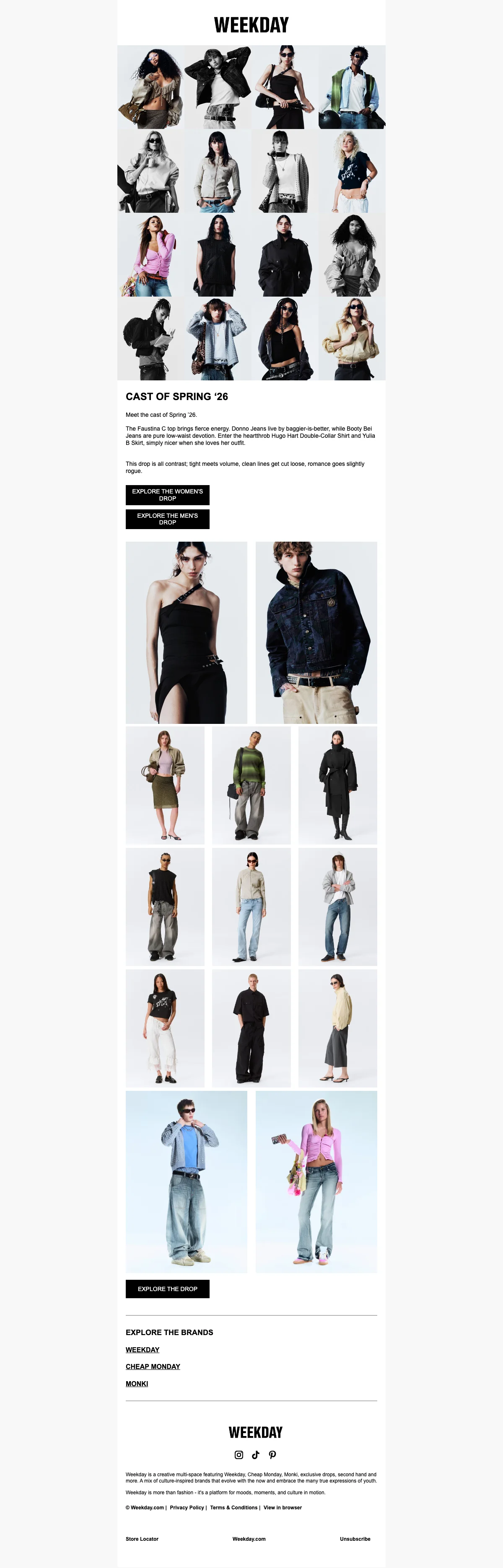 Weekday biedt een zorgvuldig samengestelde mix van dames- en herenmode, geïnspireerd door jongerencultuur en straatstijl, waarmee elke outfit een statement wordt.