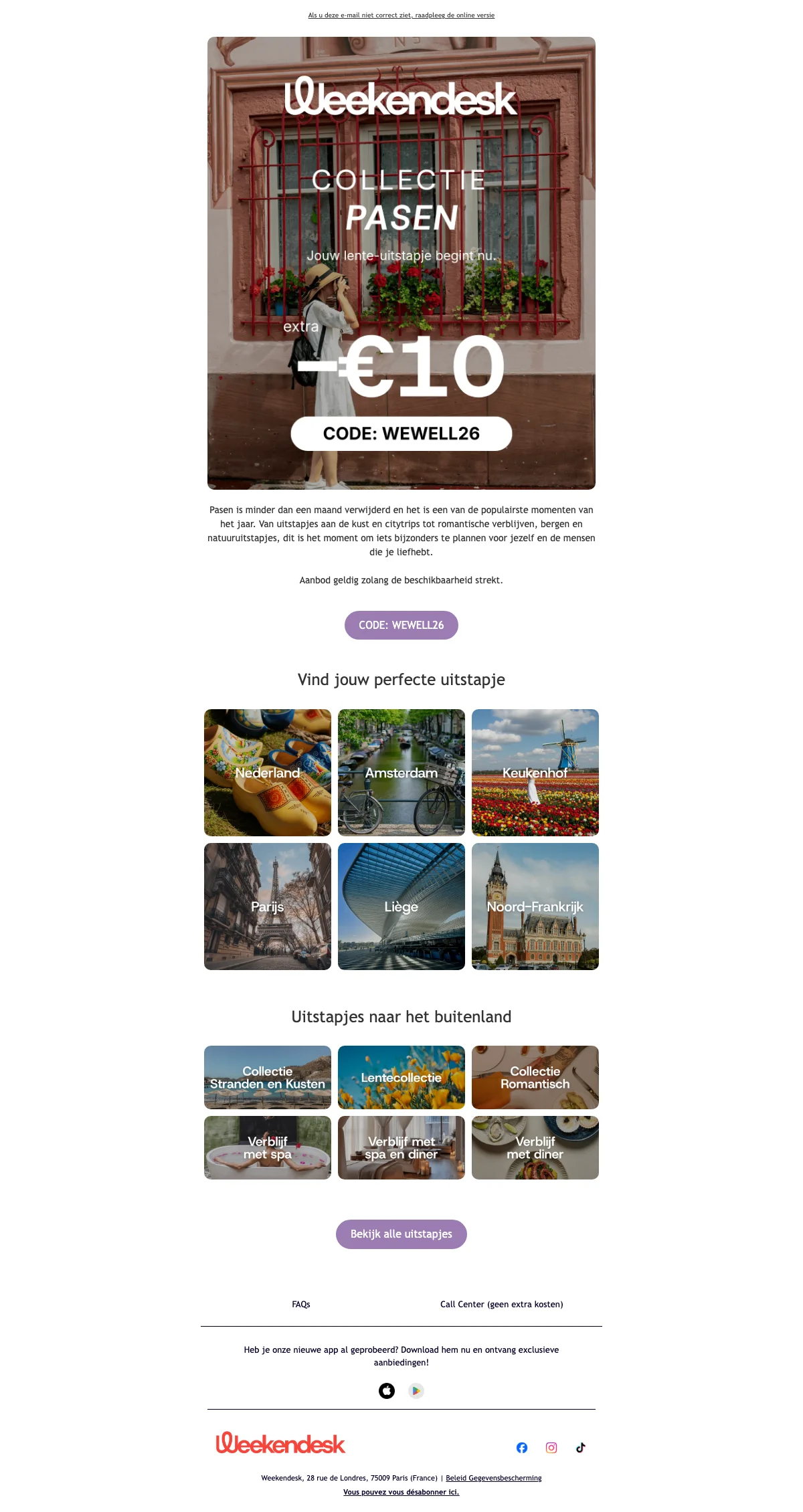 Heb je een kortingscode? Voer deze in op de betaalpagina in het veld onder annuleringsverzekering. Codes zoals WEWELL26 geven €10 korting op spa-uitstapjes vanaf €150 besteding. Kortingscodes zijn niet te combineren met andere acties tenzij anders vermeld.