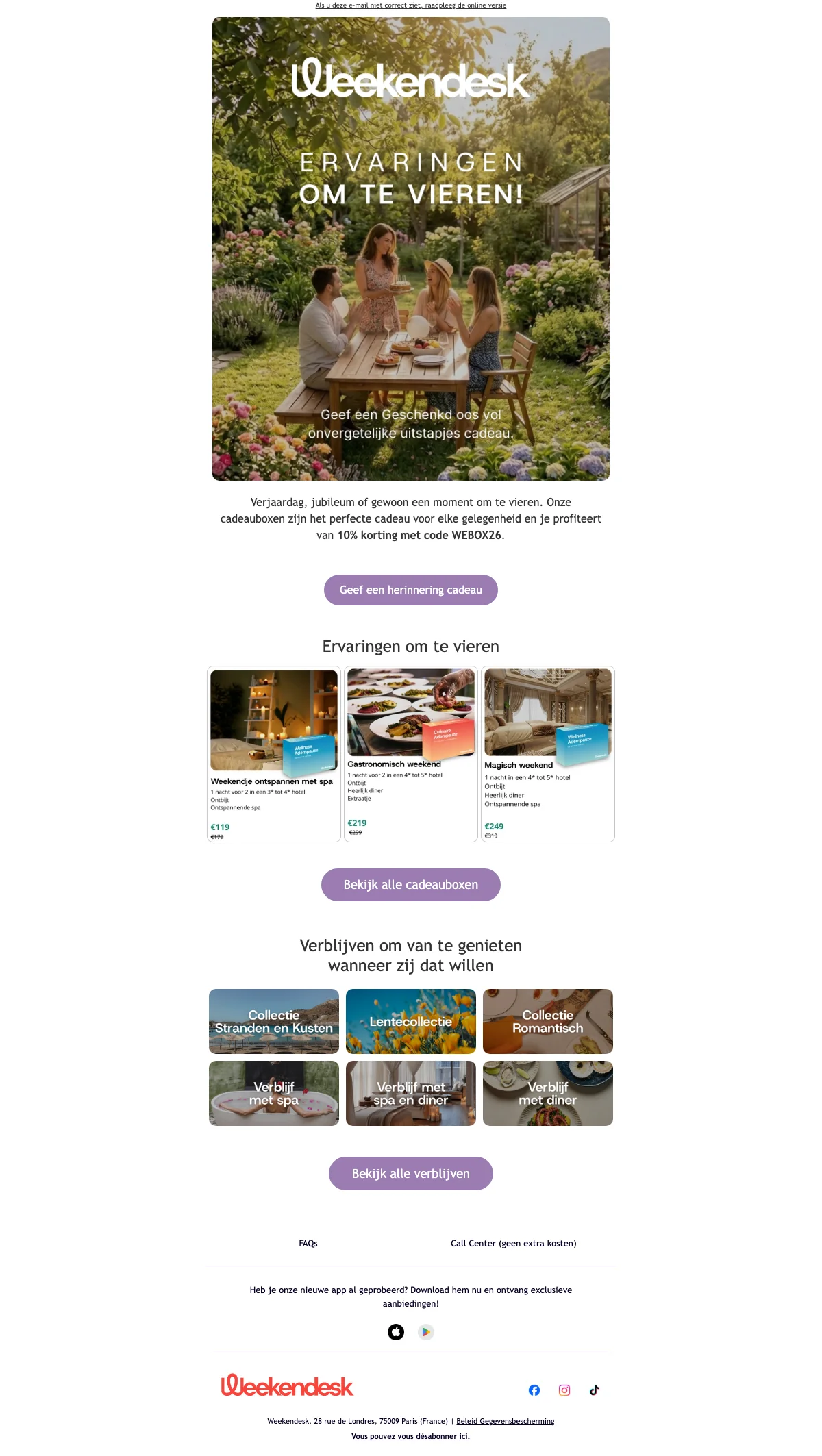 Je ontvangt de digitale versie direct per e-mail of de fysieke geschenkdoos binnen 1 tot 3 werkdagen. Verzending is gratis naar België, Nederland en Luxemburg. Met de code WEBOX26 ontvang je 10% korting op alle geschenkdozen.